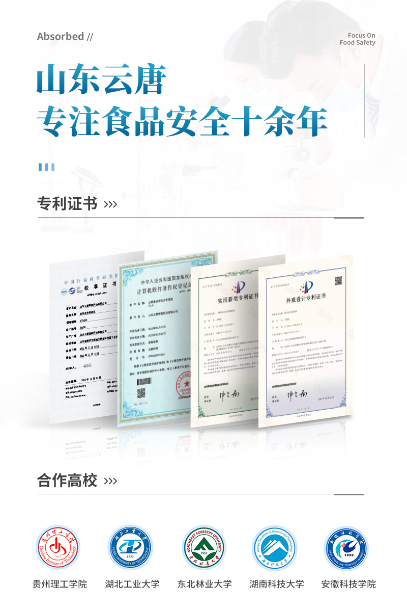 山東云唐智能科技有限公司生產的果蔬肉類檢測儀,采用手提箱式一體化設計,可快速檢測幾十種項目,包含各種蔬菜水果中有機磷和氨基甲酸酯類農藥殘留,病害肉診斷:肉中組胺、揮發性鹽基氮;各種肉食品中瘦肉精激素類殘留、抗生素、獸藥殘留等現場的定性定量檢測。